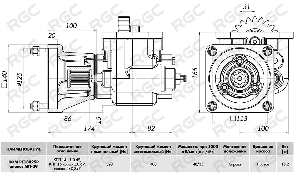 Характеристики Производитель RGC Типкоробка отбора мощности (КОМ) Монтажное положение справа по ходу движения Вращение насоса правое Крутящий момент номинальный, Нм320 Крутящий момент максимальный, Нм400 Мощность при 1000 об/мин, л.с./кВт48/35 Тип управления пневматическое Передаточное отношение КПП 14-1:0,69 ; КПП 15 норм.-1:0,69, повыш. 1:0,847 Вес, кг.15,2