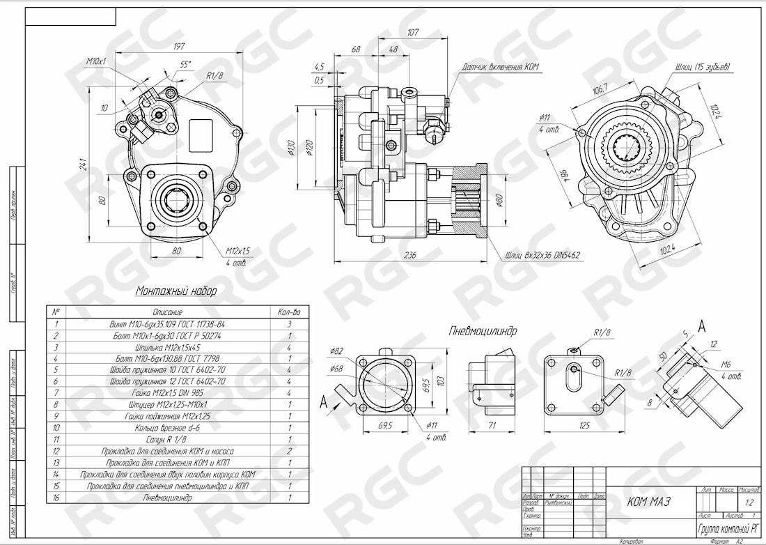 Характеристики Производитель RGC Тип коробка отбора мощности (КОМ) Монтажное положение справа по ходу движения Крутящий момент номинальный, Нм320 Крутящий момент максимальный, Нм400 Мощность при 1000 об/мин, л.с./кВт48/35 Тип управления пневматическое Направление вращения вала левое Передаточное отношение ЯМЗ 236 - 1:0,9 Материал корпуса высокопрочный чугун Вес, кг.11,35