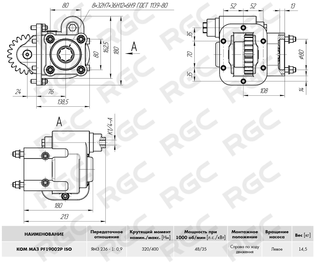 Характеристики Производитель RGC Тип коробка отбора мощности (КОМ) Монтажное положение справа по ходу движения Крутящий момент номинальный, Нм320 Крутящий момент максимальный, Нм400 Мощность при 1000 об/мин, л.с./кВт48/35 Тип управления пневматическое Направление вращения вала левое Передаточное отношение ЯМЗ 236 - 1:0,9 Материал корпуса высокопрочный чугун Вес, кг.14,5